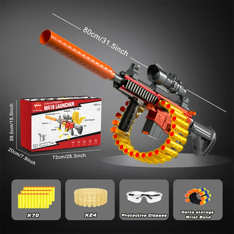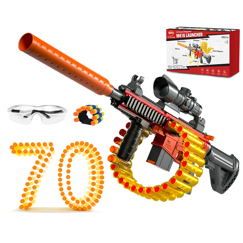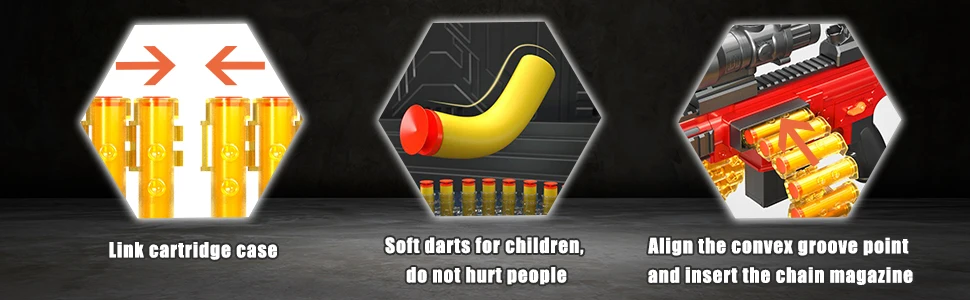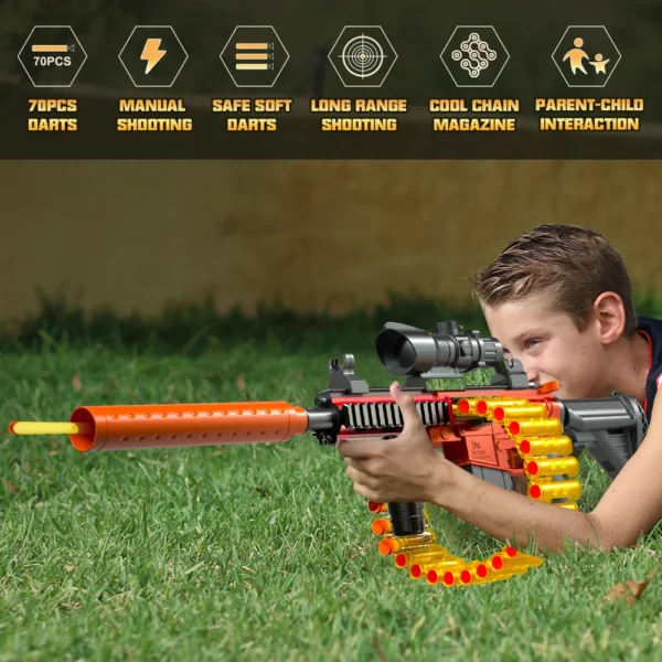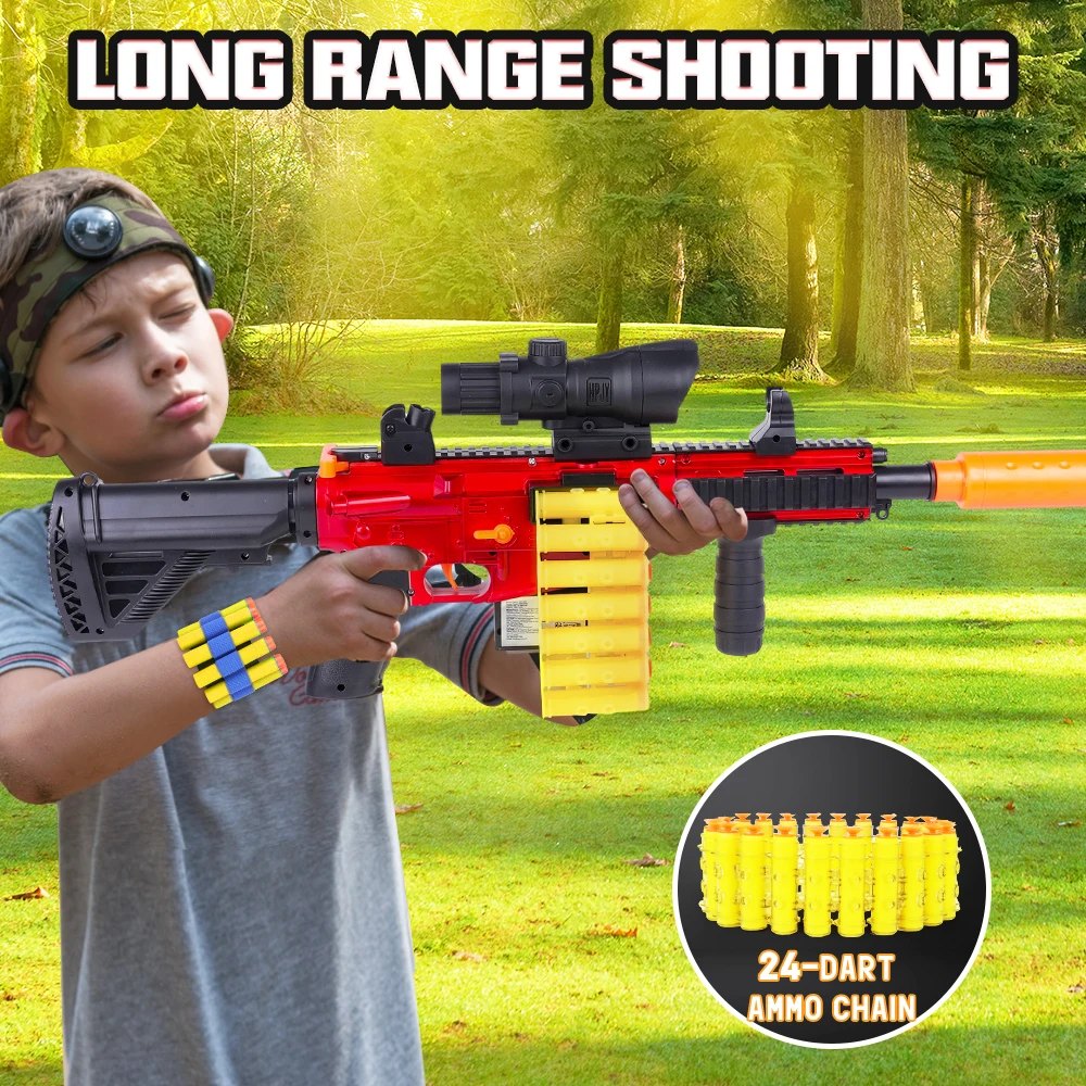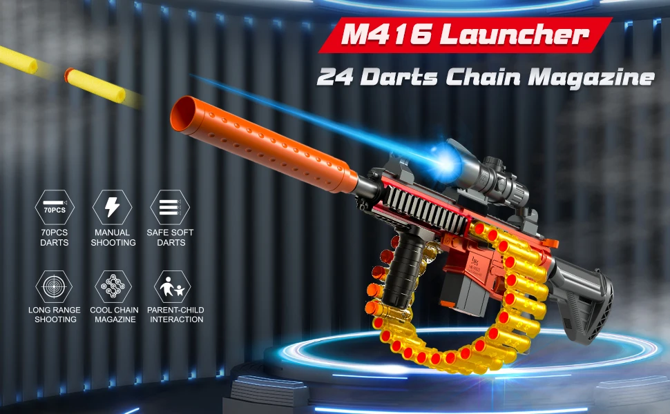 - 【Manual Foam Blasters Toy Gun】 Invite mates,wear goggles,load bullet and pull the trigger to have more shooting fun,turn your backyard into your battleground; You can keep fighting with 24-Darts chain magazine; Enjoy the most shooting game! toy gun is forever classic